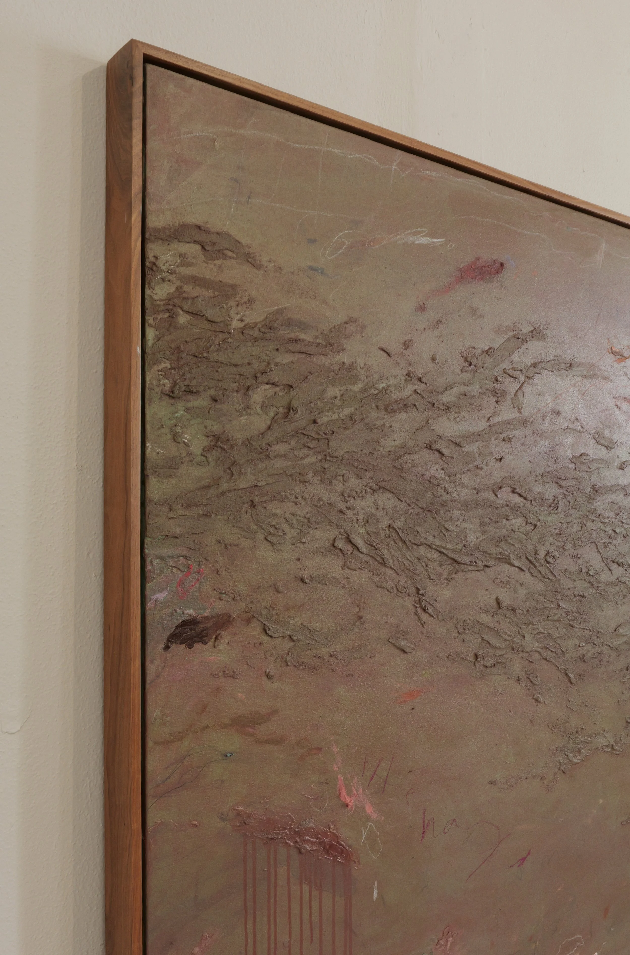 House paint, leather paint, pigment, oil, organic material, grout, pastel, pencil, crayon on canvas applied to wood