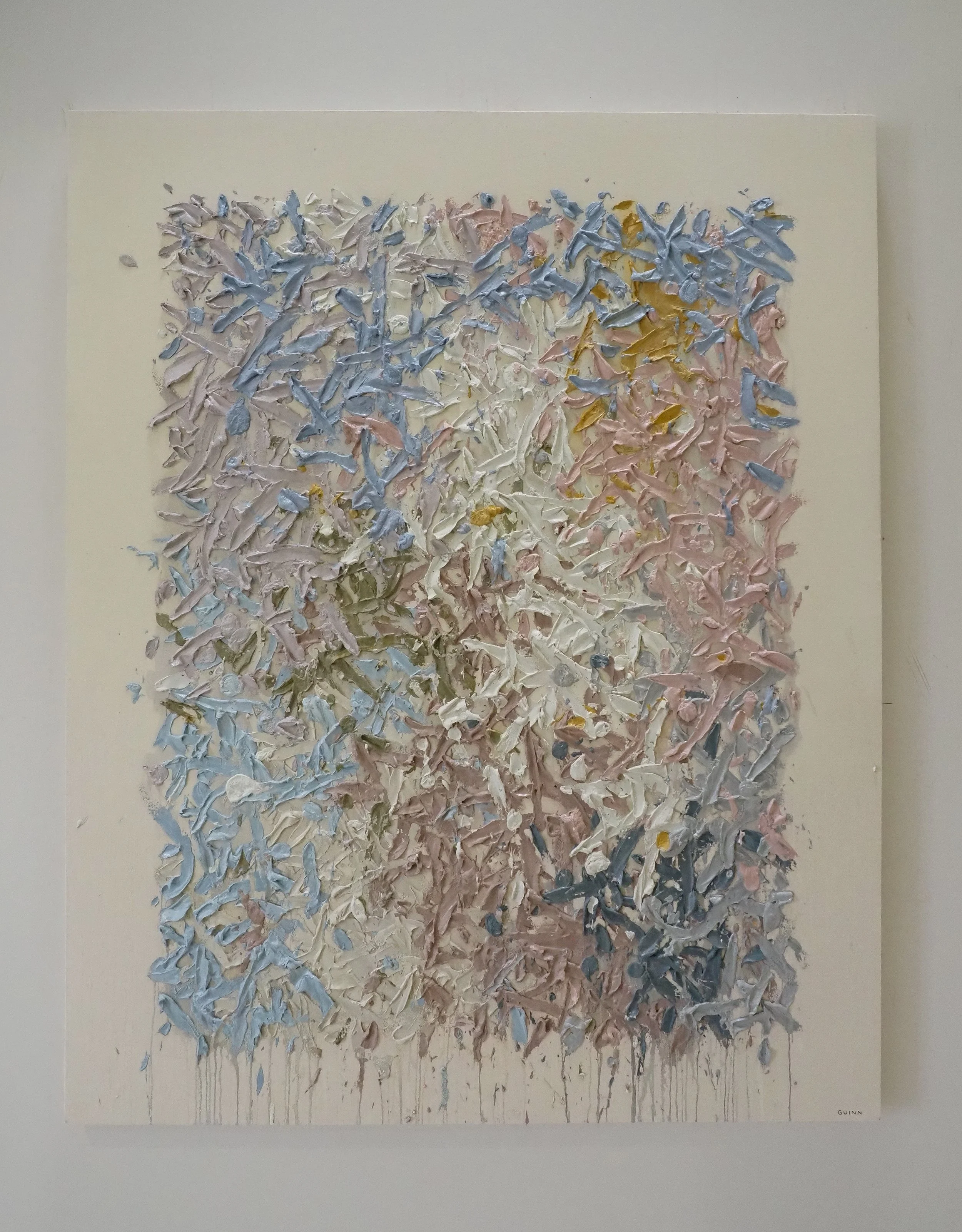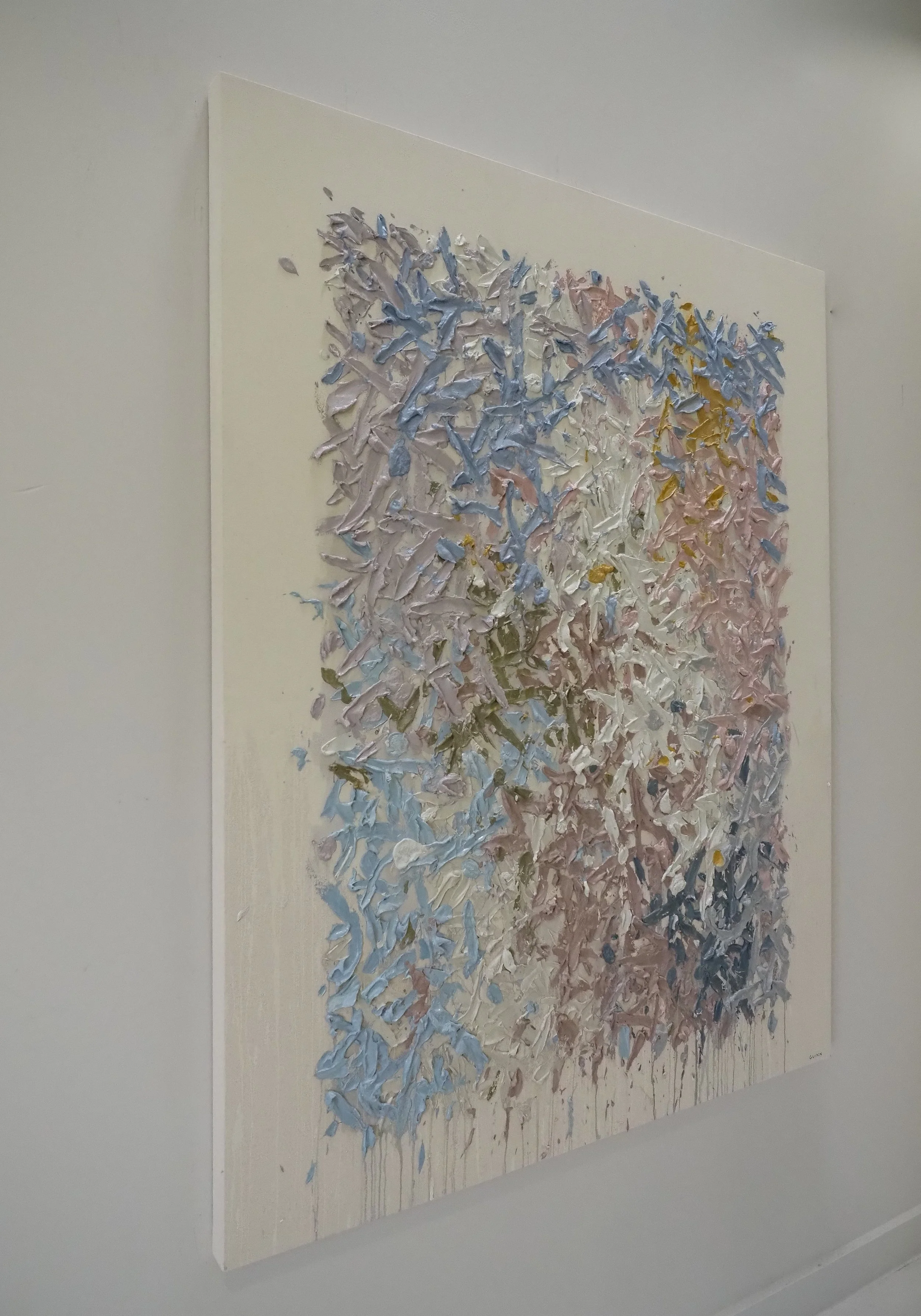 Acrylic, house paint, leather paint, coffee, grout, soil on canvas applied to wood