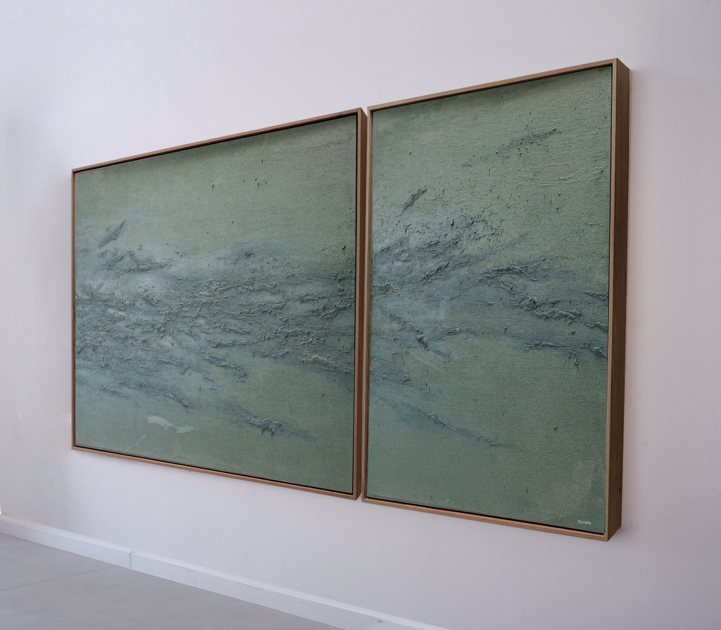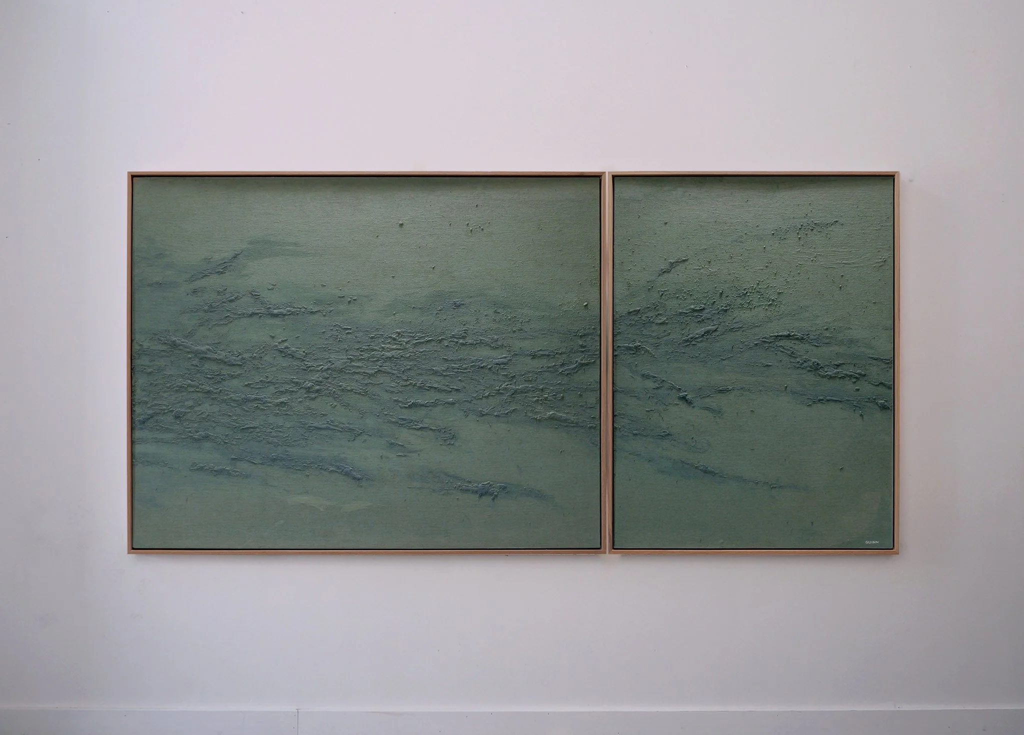 House paint, leather paint, oil, organic material, grout, pencil on linen applied to wood