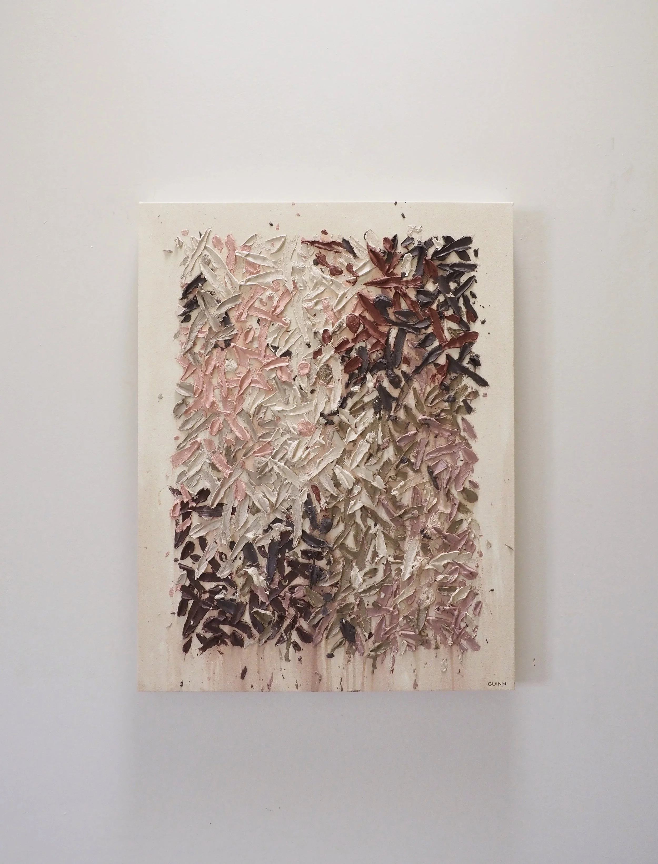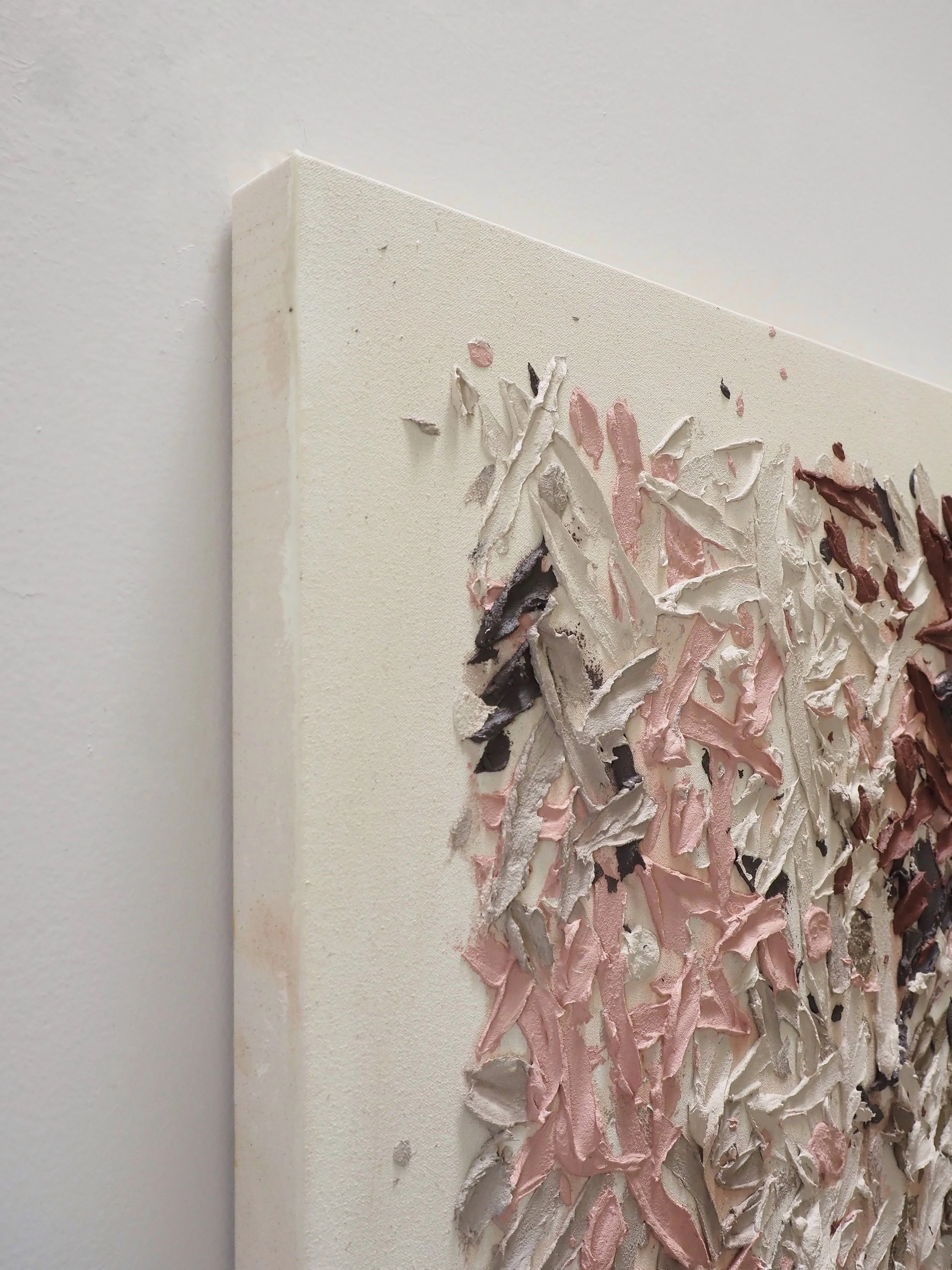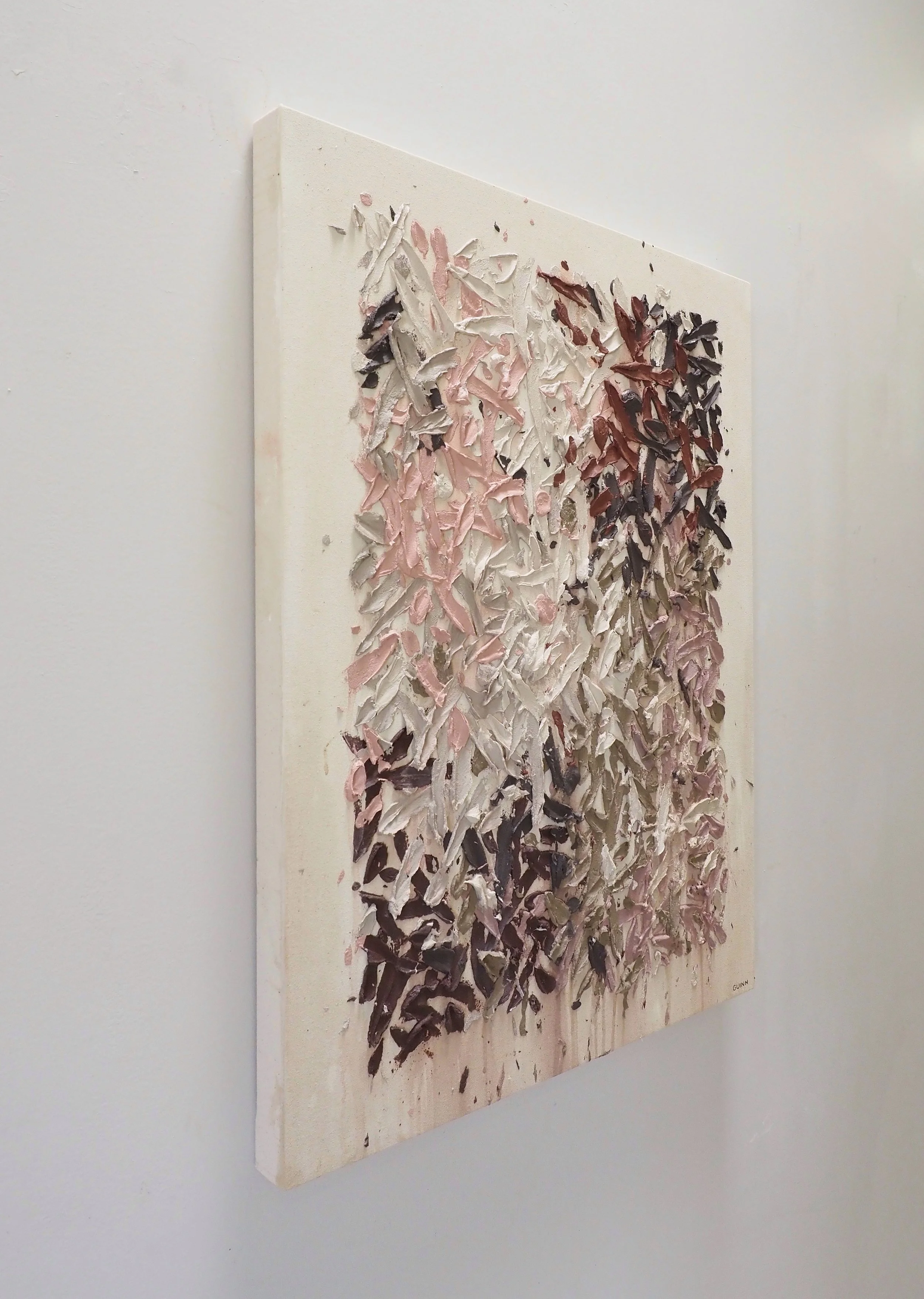 House paint, acrylic, leather paint, paste, soil on canvas applied to wood