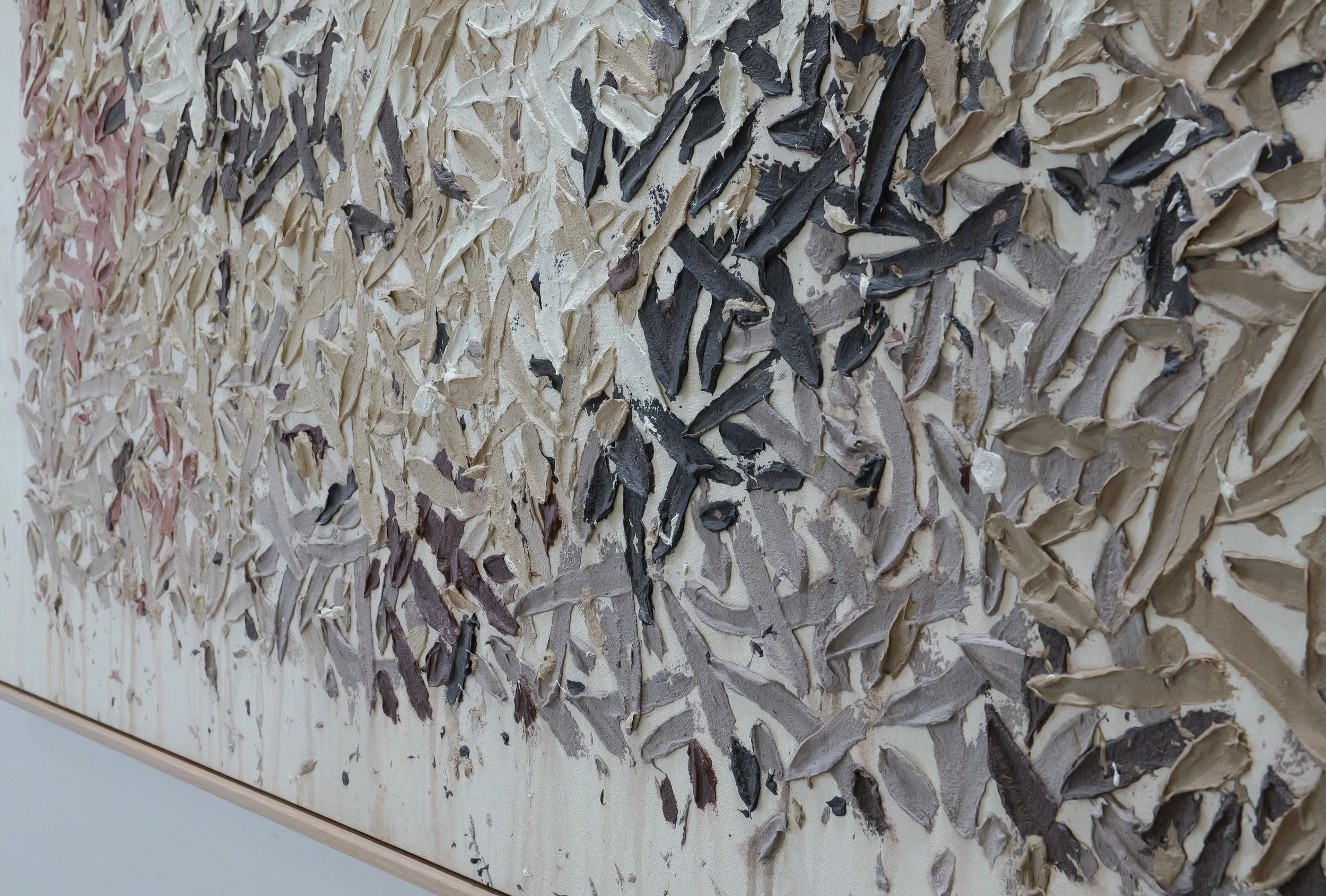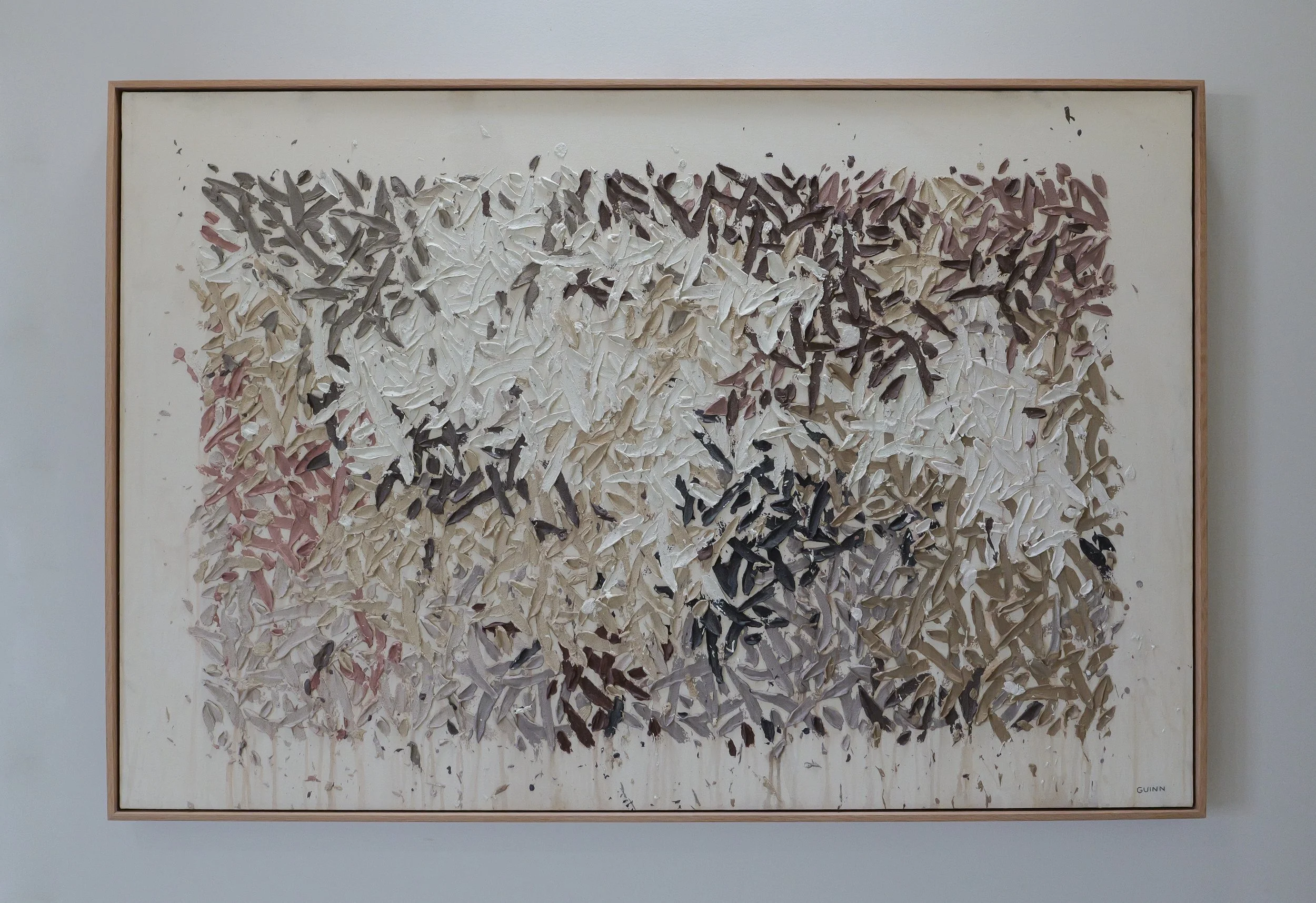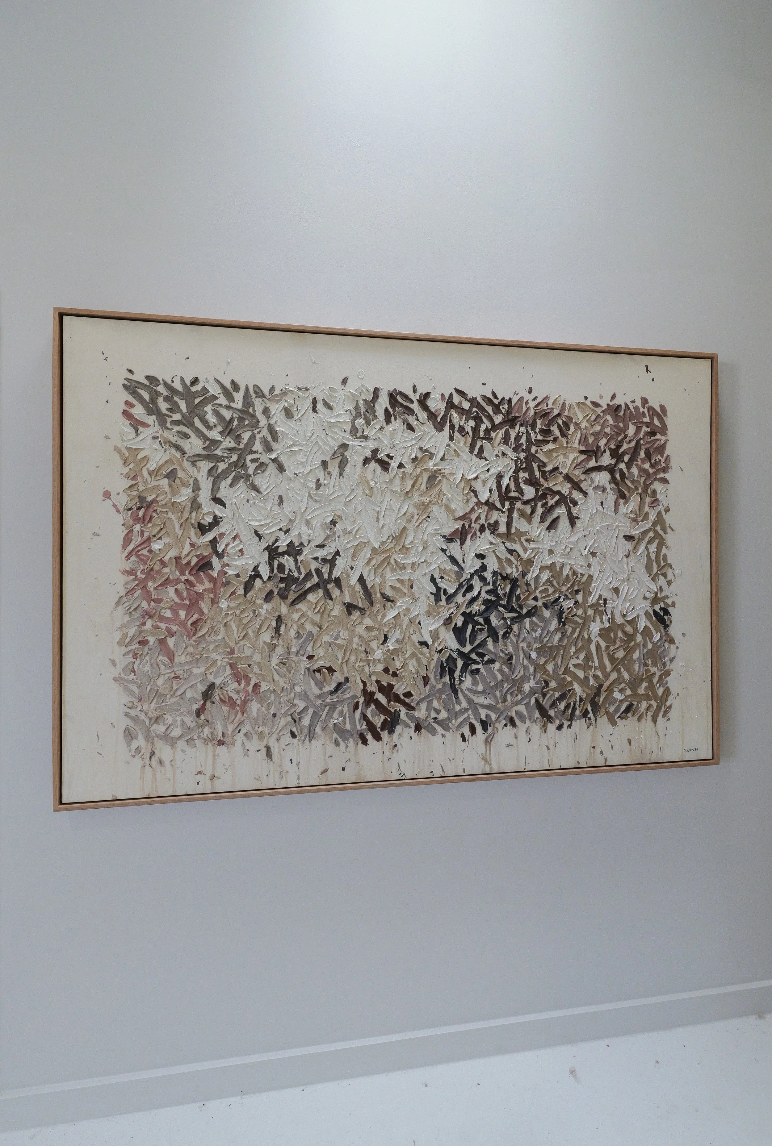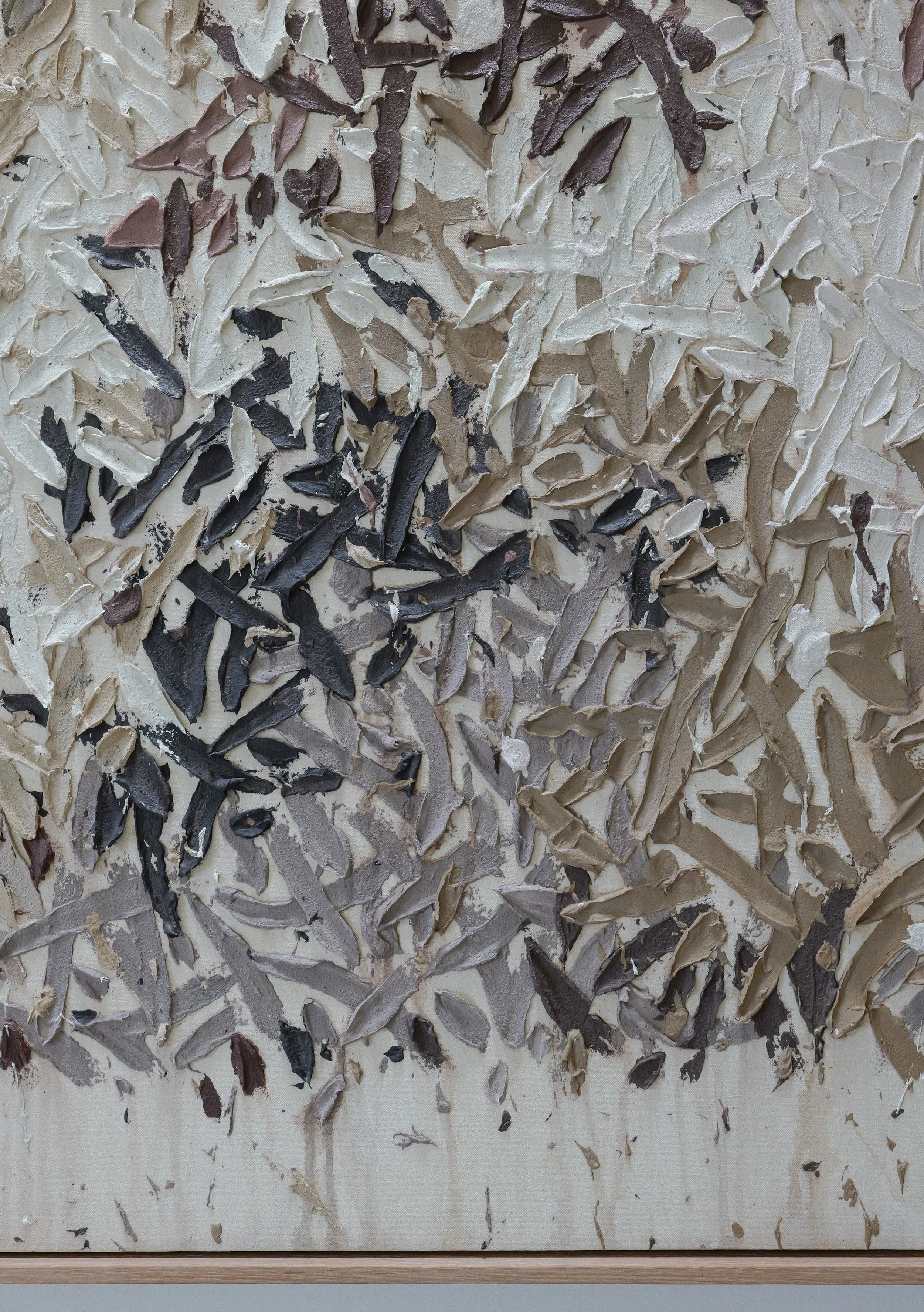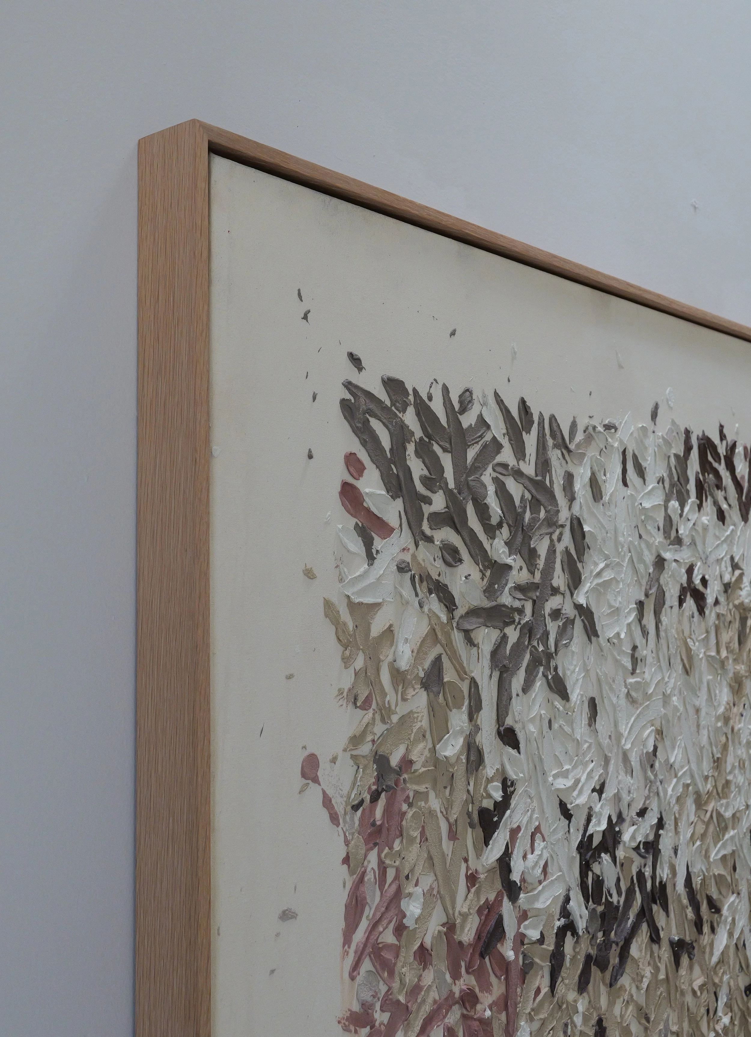 Acrylic, house paint, oil, grout, paste, coffee on canvas applied to wood