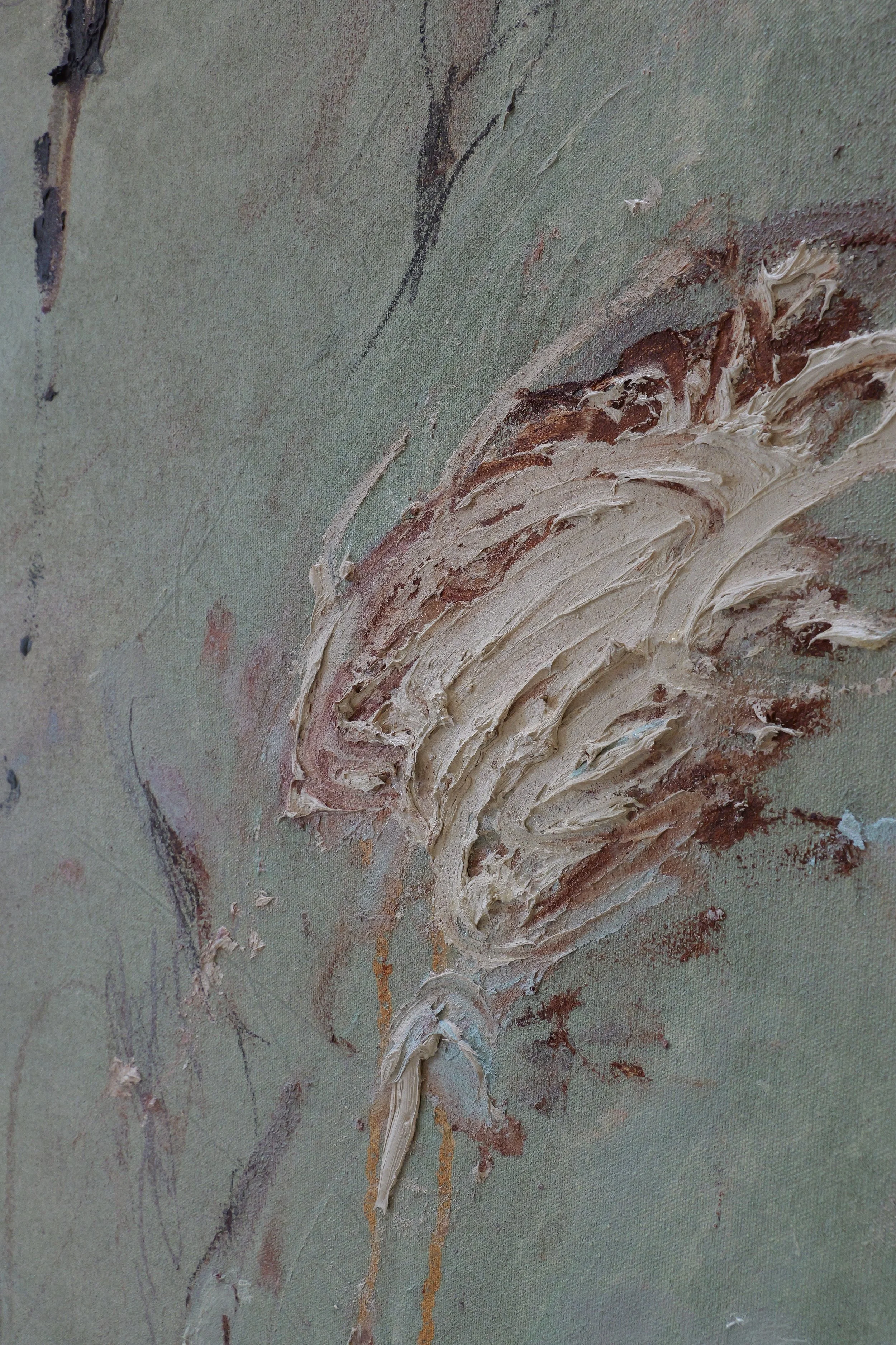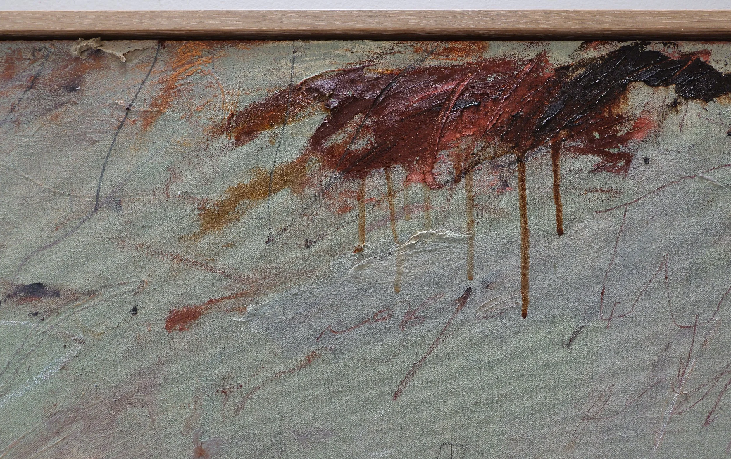 House paint, leather paint, oil, pastel, pencil, crayon, pinot noir, earth, paste on canvas applied to wood